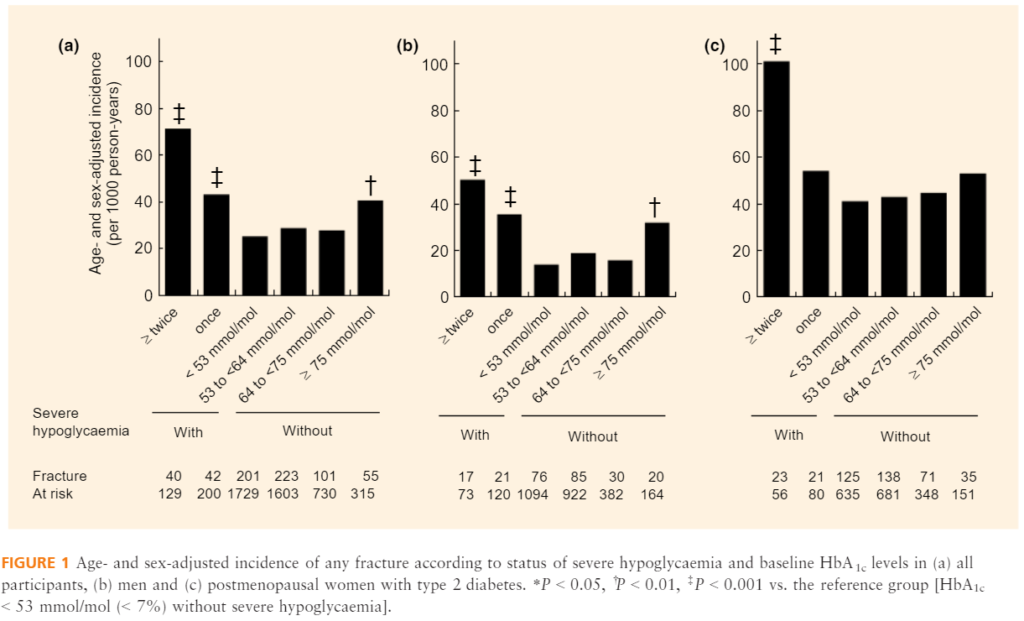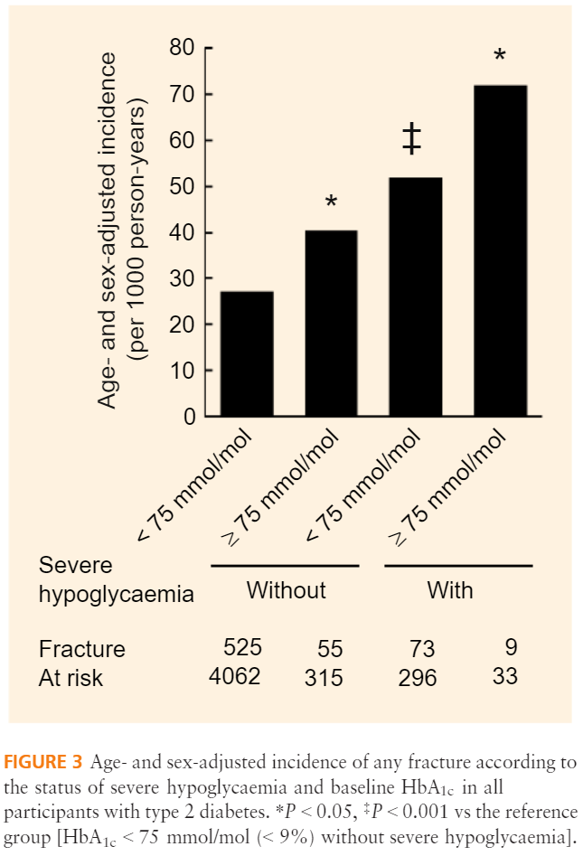 骨折予防の血糖コントロール目標は、HbA1c <75 mmol /mol(<9%)の可能性が示唆されるが、より重要なことは、「重症の低血糖」、特にその再発を避けることである。