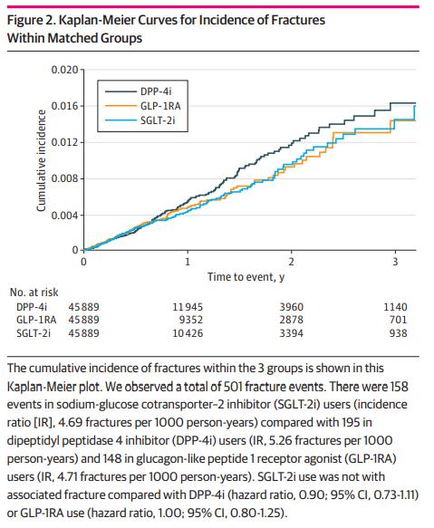 骨折転帰の追跡期間の中央値は、SGLT2阻害薬群で262日、DPP-4阻害薬群で278日、GLP-1受容体作動薬群で249日であった。