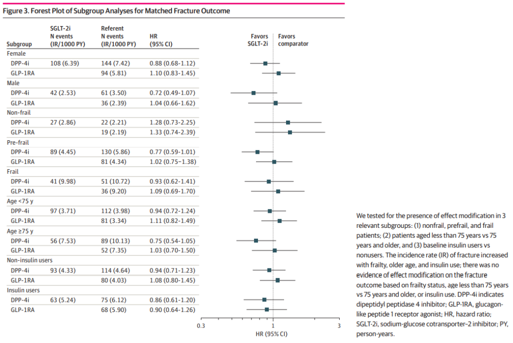また、DPP-4阻害薬群とGLP-1 受容体作動薬群と比較したSGLT2阻害薬群の「骨折リスク」を「性別(男/女)、虚弱性(非虚弱/前虚弱/虚弱)、年齢(75歳未満/以上)、インスリン使用(有/無)」のカテゴリー別にサブ解析したところ、一貫した(差がない)結果が示された。
