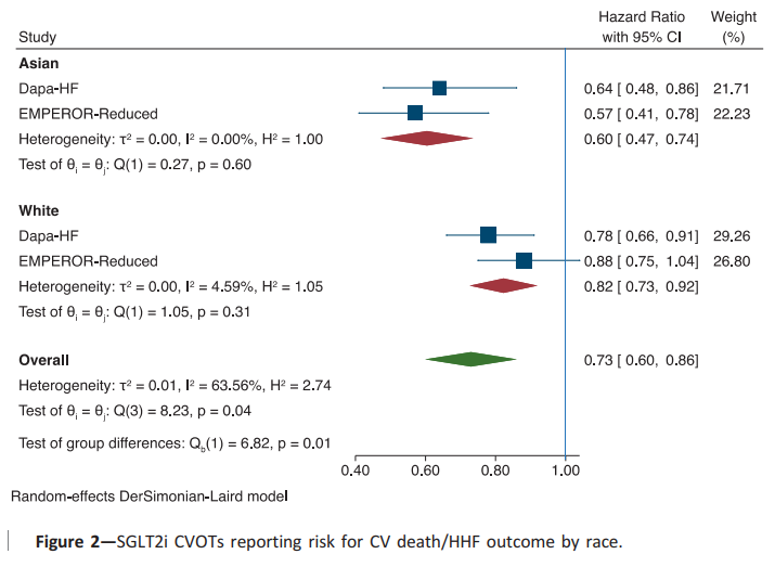 白人と比較して、アジア人の(2型糖尿病合併を含む)HFrEF患者はSGLT2阻害薬から心血管死または心不全入院のより大きな抑制効果を得られ、アジア人の2型糖尿病患者はGLP-1受容体作動薬から主要な心血管イベント(MACE)のより大きな抑制効果が得られる可能性があることが示された。