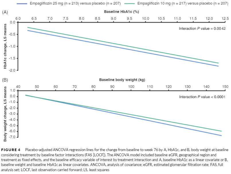 HbA1cは、24週目(p=0.0004)と76週目(p=0.0042)において、ベースラインの値が高いほど、有意に大きな減少を示した。