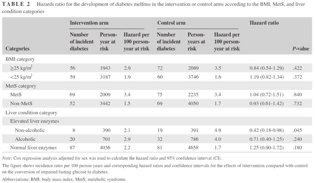 このライフスタイル介入が、「肥満(BMI≧25)」、「メタボリックシンドローム[MetS:①高トリグリセリド血症≧150mg/dL、②低HDLコレステロール血症<40mg/dL(男性)、< 50mg/dL(女性)、③空腹時高血糖≧110mg/dL、④血圧≧130/85 mmHg又は降圧薬の服用、⑤BMI≧25kg/m2の内、3つ以上に該当])、ベースラインで「非アルコール性(1日エタノール摂取量:男性≧20g、女性≧10g)の肝酵素上昇」、または「アルコール性(1日エタノール摂取量:男性<20g、女性<10g)の肝酵素上昇」の所見がある被験者における2型糖尿病の発症率に与える影響をCox回帰分析により、ハザード比(HR)を計算した。