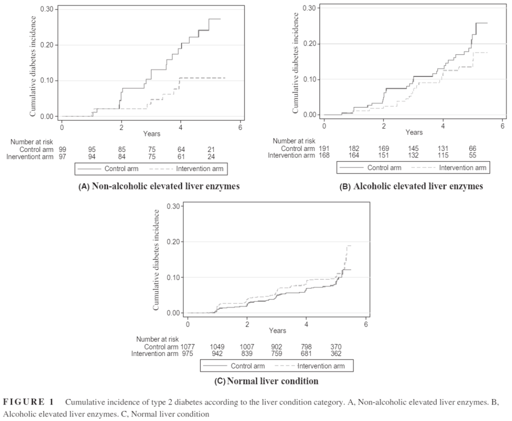 同様に、非アルコール性又はアルコール性の肝酵素が上昇した被験者の累積糖尿病発症率は、正常な肝機能の被験者と比較して、約2~3倍高かった。