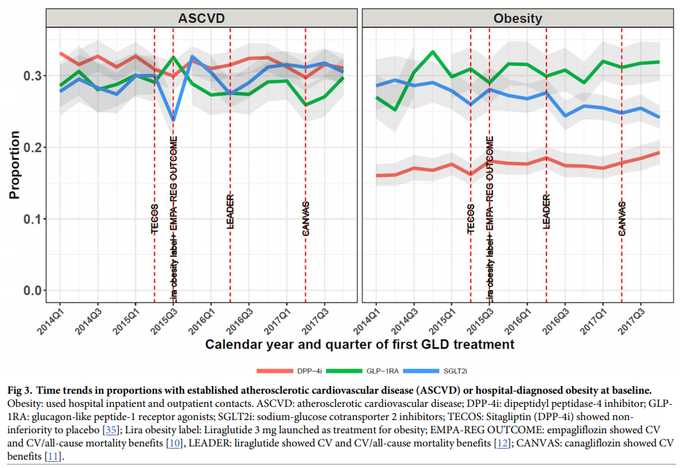 デンマークのヘルスケアデータを用いて、2014年~2017年の間に新規で治療開始されたSGLT2阻害薬(25,070例)とGLP-1受容体作動薬(14,671例)の新規処方率、投薬パターン、アテローム性動脈硬化性心血管疾患(ASCVD)等の既往患者への使用割合等を心血管アウトカムでベネフィットを証明していないDPP-4阻害薬(34,079例)と比較した。