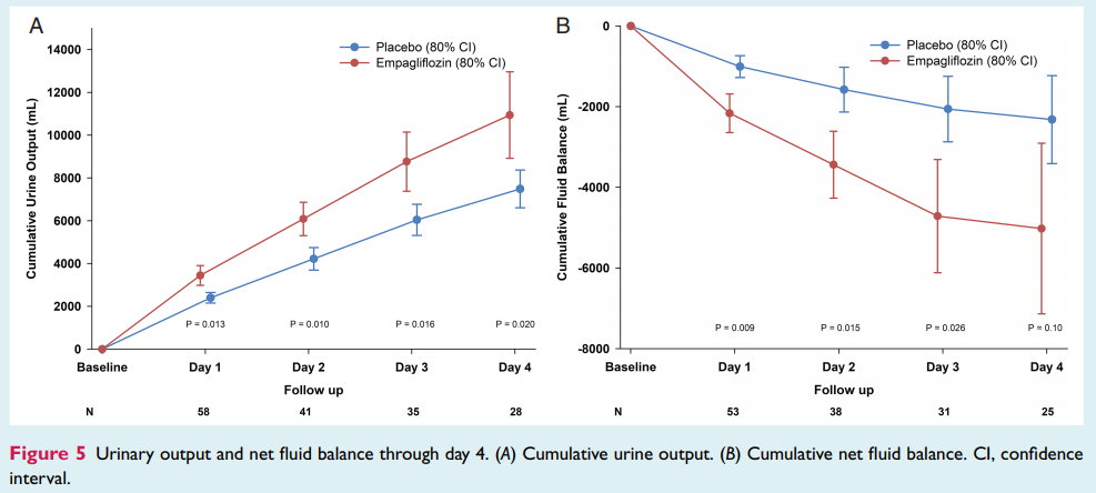 4日間の累積尿量の差(3449、95%CI 578~6321 mL)は、SGLT2阻害薬群の方が有意に大きかった(p=0.02)が、体液量の減少には差がなかった(2701、95%CI -586〜8988 mL、p=0.10)。