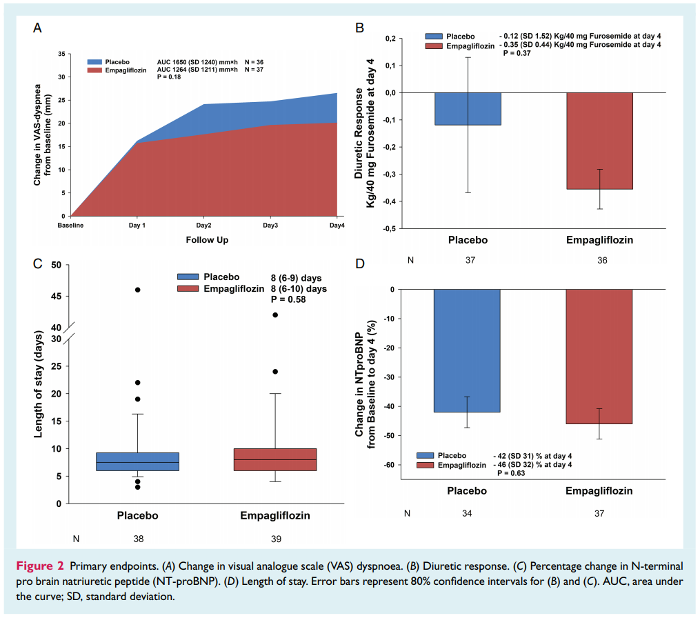 EMPA-RESPONSE-AHF試験(多施設共同、無作為化、二重盲検、プラセボ対照、並行群間、比較試験)では、糖尿病の有無に関わらず、急性HF患者80例をSGLT2阻害薬(エンパグリフロジン10㎎/日)またはプラセボを30日間無作為に割り付けた。