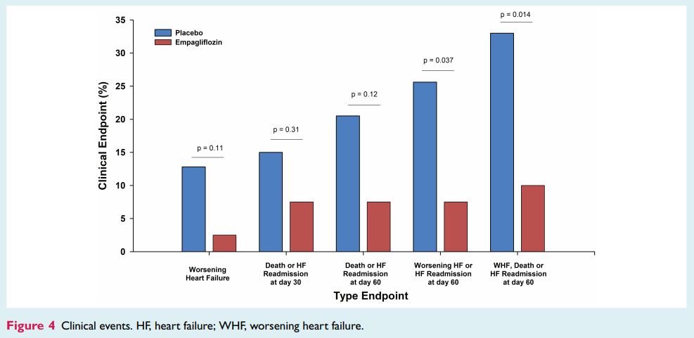 副次評価項目の「院内でのHF悪化、全死亡、60日でのHF再入院の複合エンドポイント」は、SGLT2阻害薬群では4例(10%)、プラセボ群では13例(33%)の発生があり、SGLT2阻害薬で有意な減少を示した(p=0.014)。