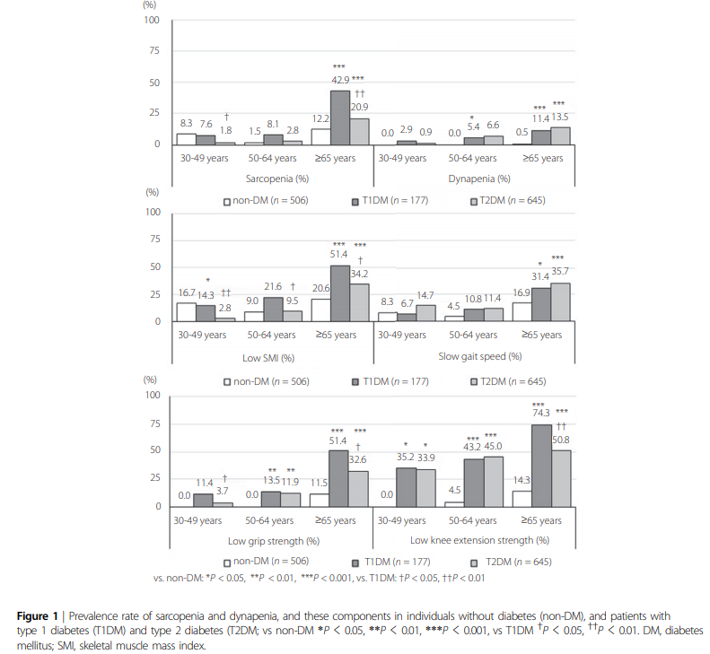 高齢者(65歳以上)の被験者における「サルコペニアとダイナペニア」の有病率は、それぞれ、非糖尿病患者で「12.2%と0.5%」、1型糖尿病患者で「42.9%と11.4%」、2型糖尿病患者で「20.9%と13.9%」となり、非糖尿病患者と比較して、1型および2型糖尿病患者の「サルコペニアとダイナペニア」の有病率は有意に高い(p<0.001)ことが観察された。