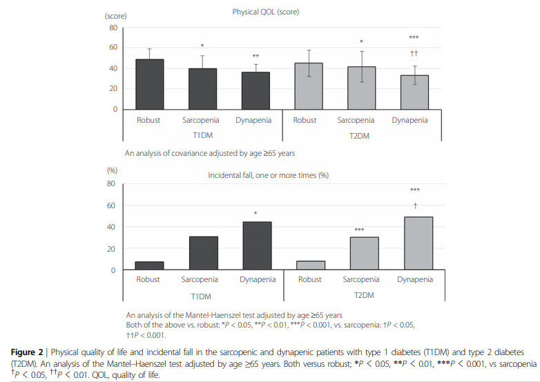 サルコペニアとダイナペニアの有病率は、非糖尿病患者に比し、1型および2型糖尿病患者でより高率に観察され、QOLの低下と偶発的な転倒の一因となることが示唆された。