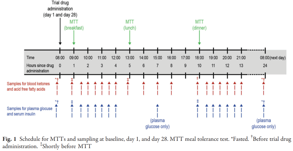 主要評価項目は、「28日目の朝食3時間後の血糖曲線下面積(AUC1-4h)の変化、食後血糖値変化の追加測定、空腹時血糖、食後インスリンの曲線下面積(AUC)、29日目の空腹時(朝8時)に測定した遊離脂肪酸と総ケトン体の変化」とした。