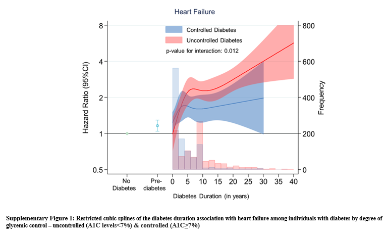 糖尿病罹病期間と糖尿病患者のHFリスクの間には、ほぼ線形の関係があり、HbA1Cが7%未満よりも7%以上の方が急勾配のリスク増加が認められた。