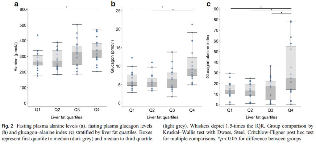 空腹時のアラニン、グルカゴン、グルカゴン-アラニン指数は、肝臓脂肪含有量と相関していた。