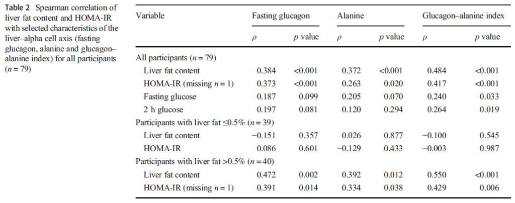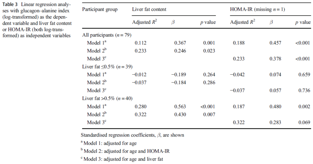同様に、「研究コホート全体と肝臓脂肪含有量が0.5%を超える」被験者で、年齢(Model1)、または年齢と肝臓脂肪含有量(Model3)の調整後においても、「HOMA-IRはグルカゴン-アラニン指数と有意な相関」が示された。