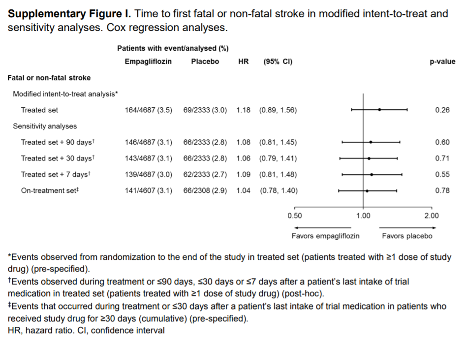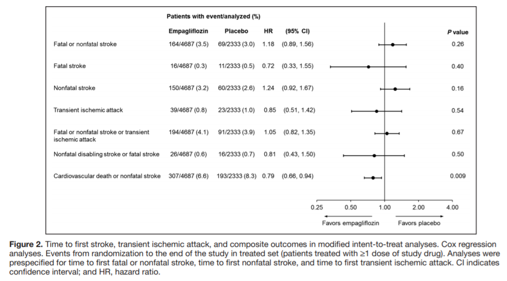 intent-to-treat(ITT)解析による、非致死的脳卒中、致死的脳卒中、後遺障害を伴う(disabling)脳卒中、一過性脳虚血発作(TIA)の発症リスクは、エンパグリフロジン群とプラセボ群に差はなかった。