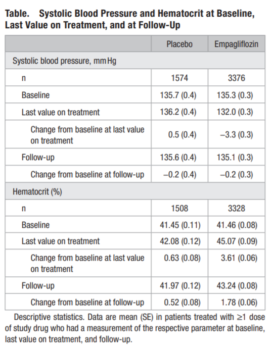 エンパグリフロジン群では、ヘマトクリット値は治験中に増加したが(ベースラインからの平均変化:3.61%[±0.06])、フォローアップ時(治療終了30日後)には、ベースラインの値に近づいていた(ベースラインからの平均変化:1.78%[±0.06])。