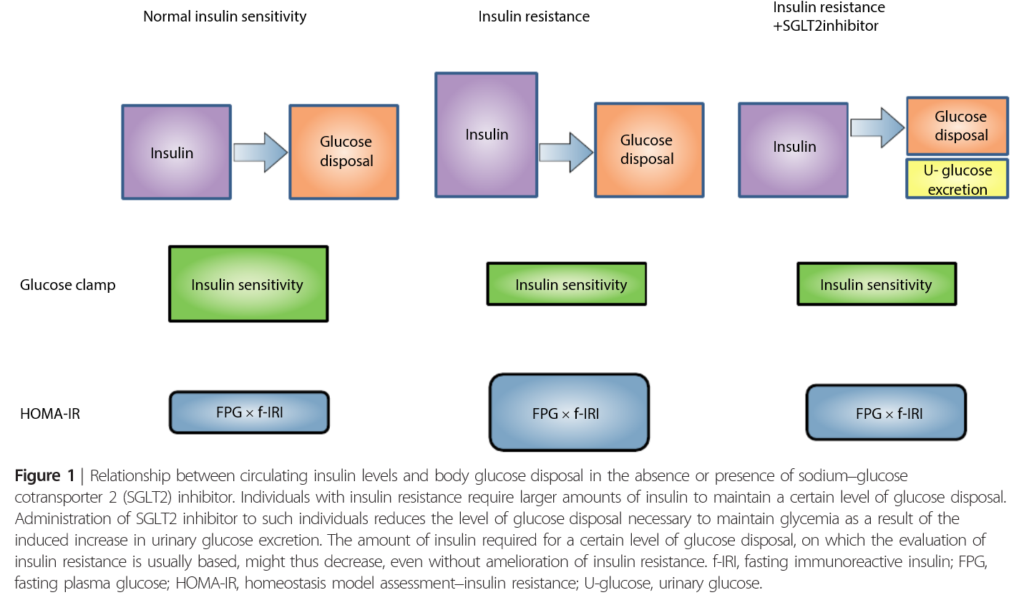 最近の研究によると、SGLT2阻害薬で治療された2型糖尿病患者においても、HOMA-IRと高インスリン正常血糖クランプ法(グルコースクランプ法)は、線形相関が示された。