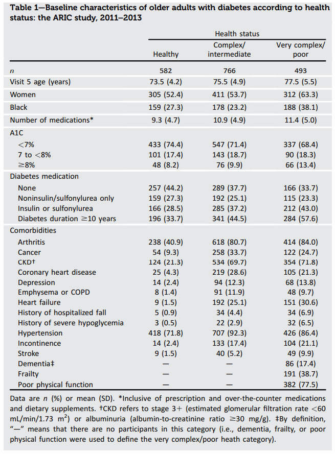 1,841例の被験者(女性56%、黒人29%)は、32%が健康、42%が複雑/中程度、27%が非常に複雑/悪い(認知症、フレイル、低身体機能を含む)の健康状態に分類された。