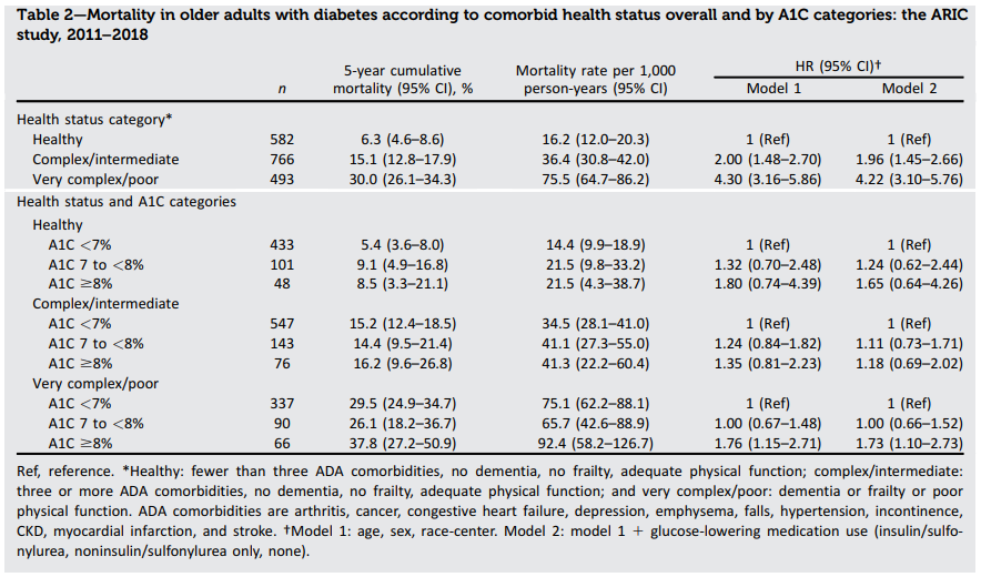 本研究結果は、2021年のADAガイドラインを支持しており、一部の高齢者糖尿病では7%未満のHbA1cが妥当な治療目標であることが示された。