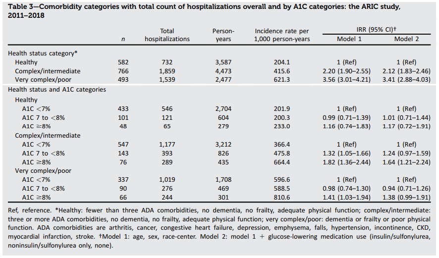 本研究では、ADAで定義された健康状態[健康、複雑/中程度、非常に複雑/悪い(認知症、フレイル、低身体機能を含む)]と血糖値(HbA1c<7%、7〜 <8%、≥8%)のカテゴリーにおける高齢者糖尿病の死亡および入院のリスクを評価した。