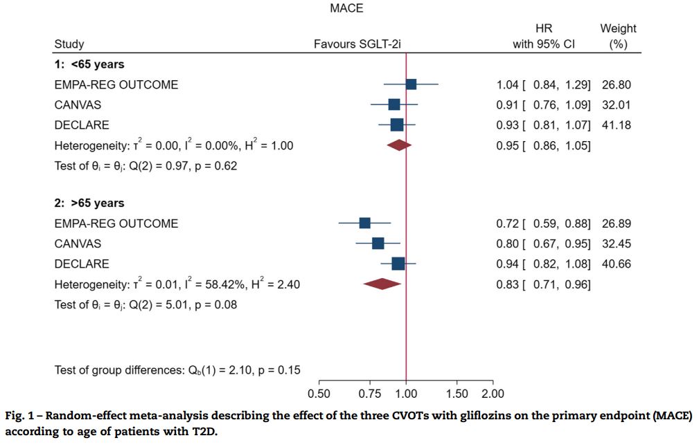 となり、MACEに対する有意な効果は「65歳以上」で示されたが、年齢に関わらずSGLT2阻害薬のMACEに対する効果は同程度であった(交互p=0.15)。