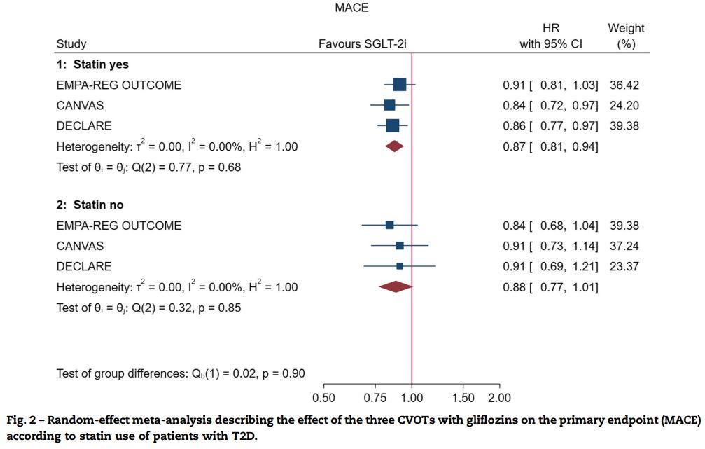 となり、MACEに対する有意な効果は「スタチン使用有」で示されたが、スタチンの使用有無に関わらずSGLT2阻害薬のMACEに対する効果は同程度であった(交互p=0.90)。
