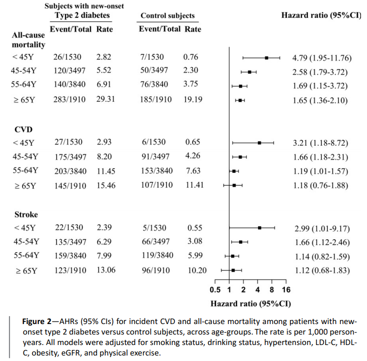 Cox回帰モデル(喫煙状態、飲酒状態、高血圧、LDL-C、HDL-C、肥満、eGFR、運動で調整)を使用して、新規で2型糖尿病を発症した被験者と対象被験者の「全死亡、CVD、脳卒中」における年齢別(<45歳、45-54歳、55-64歳、≧65歳)の平均ハザード比(AHR)を評価した。