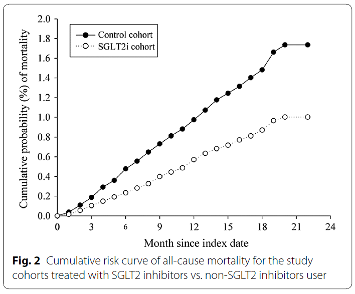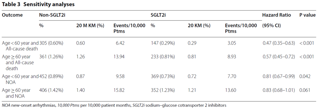 実臨床において、SGLT2阻害薬を服用している2型糖尿病患者は、SGLT2阻害薬を服用していない2型糖尿病患者と比較して、全死亡と不整脈の新規発症リスクが低いことが示された。
