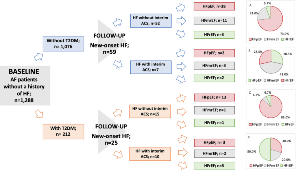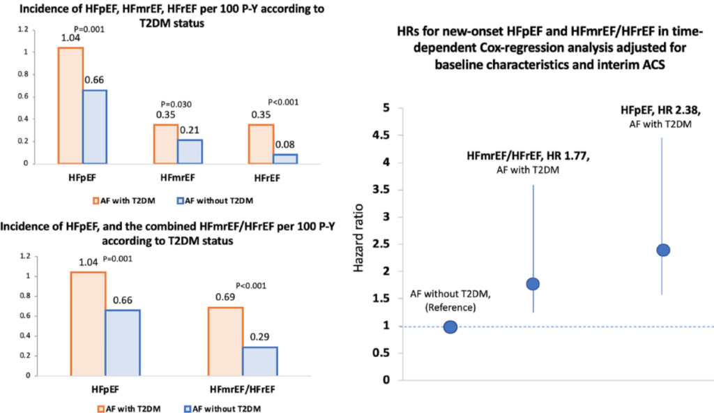 ベースラインでHF既往無のAF患者で新規発症したHFのサブタイプは、ベースラインでのT2DM既往有無とフォローアップ期間中、およびHF新規発症前に発症したACS(急性冠症候群)によって著しい影響を受けた。