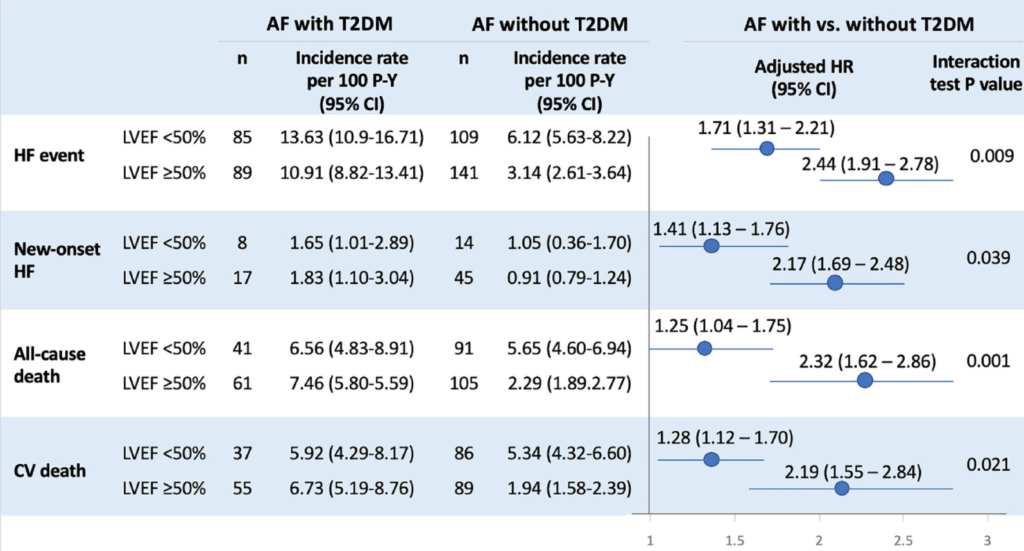 となり、全ての臨床転帰リスクは、「T2DM既往無、かつLVEF<50%のAF患者」よりも、「T2DM既往有、かつLVEF≧50%のAF患者」で2倍以上となった。