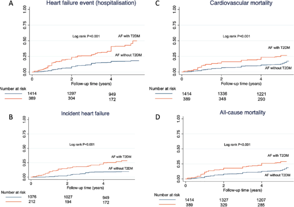 2型糖尿病の既往が有る心房細動患者の臨床転帰(心不全による入院、心不全の新規発症、全ての原因による死亡、心血管死)リスクは、2型糖尿病の既往が無い心房細動患者と比較して、有意に高かった。