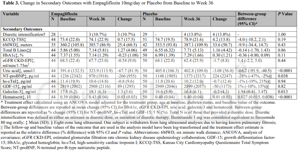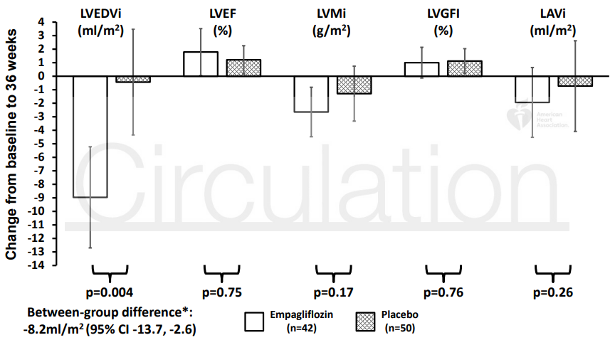 また、プラセボ群と比較して、SGLT2阻害薬群(エンパグリフロジン)は、左室拡張末期容積係数(LV EDVI)[-8.2 ml/m2(95%CI -13.7〜-2.6)、p=0.0042]とNT-proBNP[28%(95%CI 2〜47)、p=0.038]を有意に減少された。