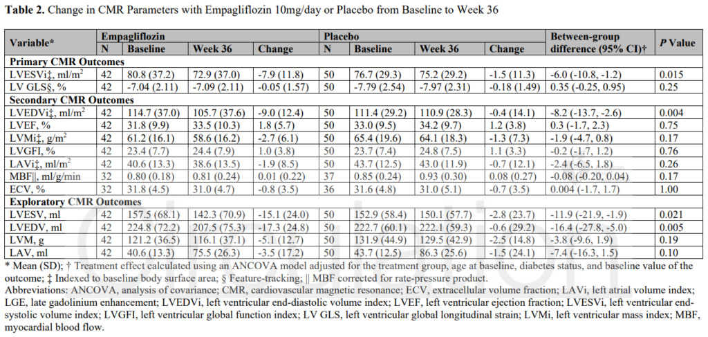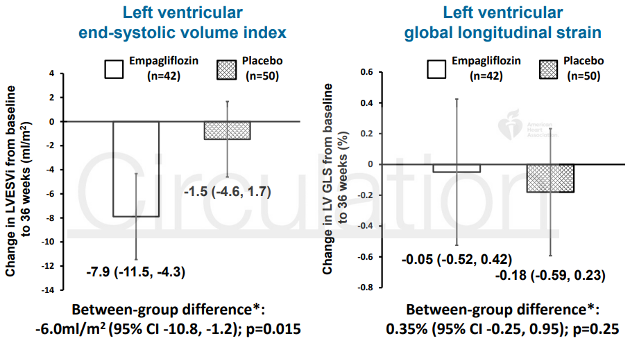 プラセボ群と比較して、SGLT2阻害薬群(エンパグリフロジン)は、左室収縮末期容積係数(LV ESVI)を有意に減少させた[-6.0 ml/m2(95%CI -10.8〜-1.2)、p=0.015]。