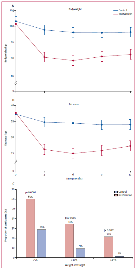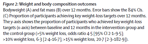 さらに、ベースラインから12ヶ月の間に「体重の15%を超える体重減少の達成率」は、介入群で21%、対照群で1%となり、介入群の達成率の方が有意に高かった(p<0.0001)。
