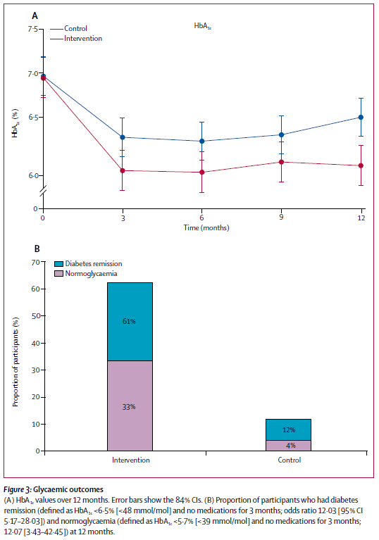 ベースラインから12ヶ月の間に「血糖が正常化(HbA1c<5.7%、糖尿病治療薬が3ヶ月無投薬)した割合」は、介入群で33%、対照群で4%となり、オッズ比は、[OR 12.07(95%CI 3.43~42.45)]となった。