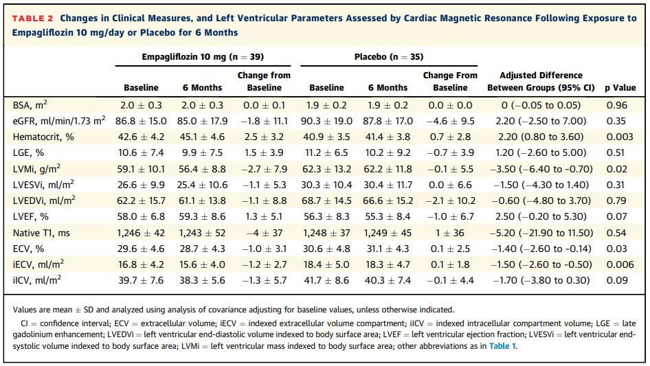 6か月の間に、平均iECV(細胞外コンパートメント)ml/m2は、SGLT2阻害薬群で16.8±4.2 から15.6±4.0に、プラセボ群で18.4±5.0から18.3±4.7に減少した。
