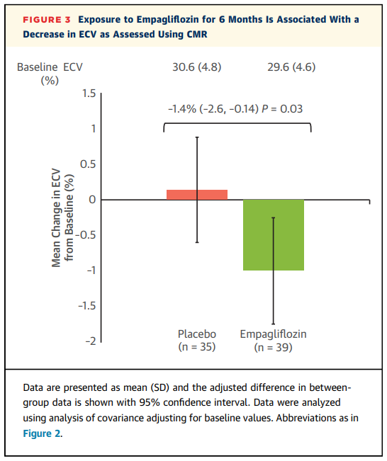 プラセボ群と比較して、SGLT2阻害薬群のベースラインで調整したLVECVの変化は、-1.40 (95%CI -2.60〜-0.14)%となり、有意な減少を示した(p=0.03)。
