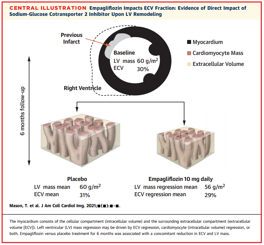 2型糖尿病を合併した冠状動脈疾患の患者において、レニン-アンジオテンシン系抑制薬を含む標準治療薬にSGLT2阻害薬(エンパグリフロジン10㎎/日)の治療を6ヶ月間追加することにより、左室の心筋細胞外容積分画(ECV)、細胞外コンパートメント(iECV)、左室心筋重量係数(LVMi)が有意に減少した。