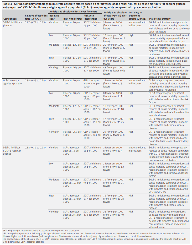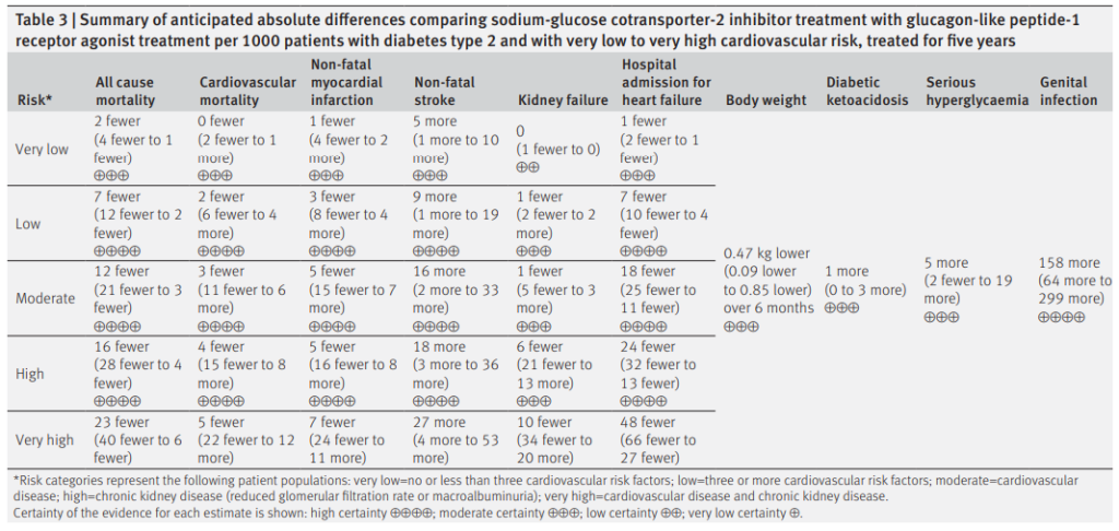 両クラスの薬剤は、「全死亡、心血管死、非致死的心筋梗塞、腎不全」を低下させることが示された(高い確実性)。