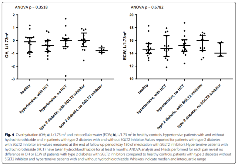 SGLT2阻害薬で6ヶ月間治療された患者の体液状態(過剰水分、細胞外液量)は、サイアザイド系利尿薬のヒドロクロロチアジドで治療されている高血圧患者、健常者と差がなかった。