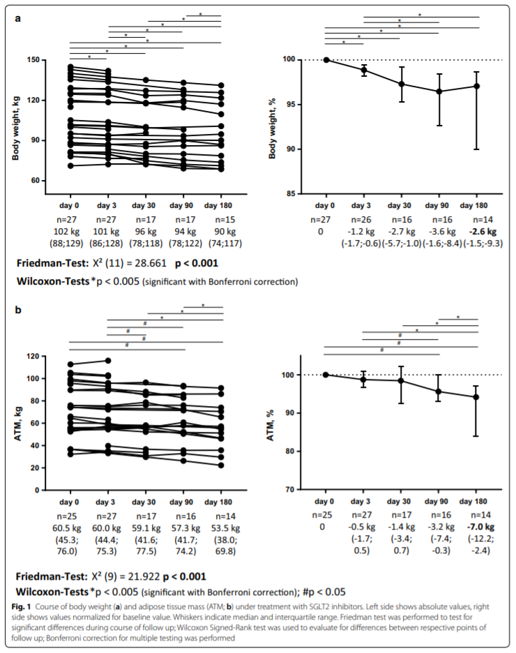 生体インピーダンス分光法により、SGLT2阻害薬による6ヶ月後の治療は、体重【参考:脂肪量+徐脂肪量[体細胞量(細胞内液量+蛋白質)+細胞外量(細胞外液量+骨量)]】を低下させたが、徐脂肪量の変化は(減少は治療開始初期のみ)安定しており、脂肪量の有意な減少が影響していたことが示された。