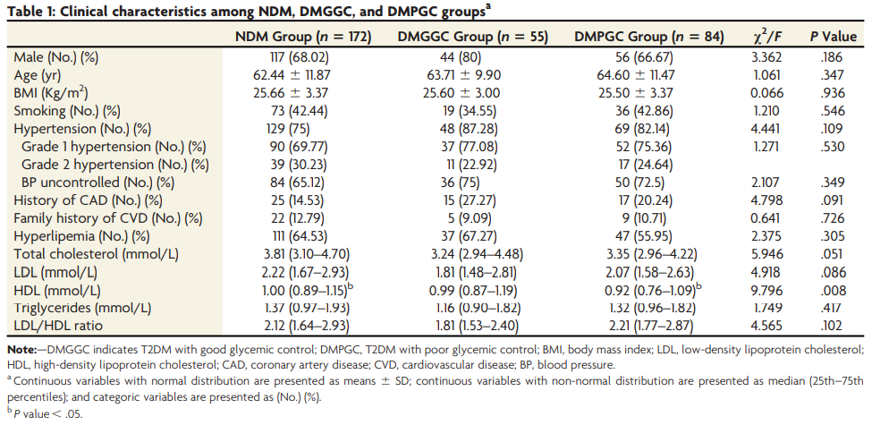 NDM群[1.00(IQR 0.89-1.15)mmol L]と比較して、血糖コントロールが不良なT2DM群[0.92(IQR 0.76-1.09 )mmol L]は、HDL(高密度リポタンパク質コレステロール)が有意に低かった(p<0.05)。