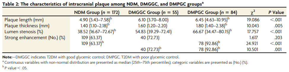 2型糖尿病患者の血糖コントロール不良は、罹病期間よりも、頭蓋内アテローム性動脈硬化症プラークの長さ、厚さ、狭窄、有病率により大きな影響を与えることが示唆された。