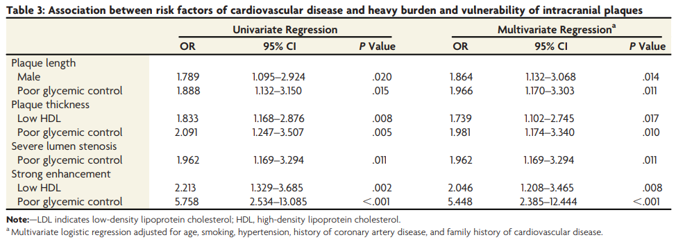 多変量ロジスティック回帰分析を使用し、年齢、高血圧、喫煙、冠動脈疾患の既往、心血管疾患の家族歴を調整後の頭蓋内プラークの危険因子(オッズ比)は、それぞれ、