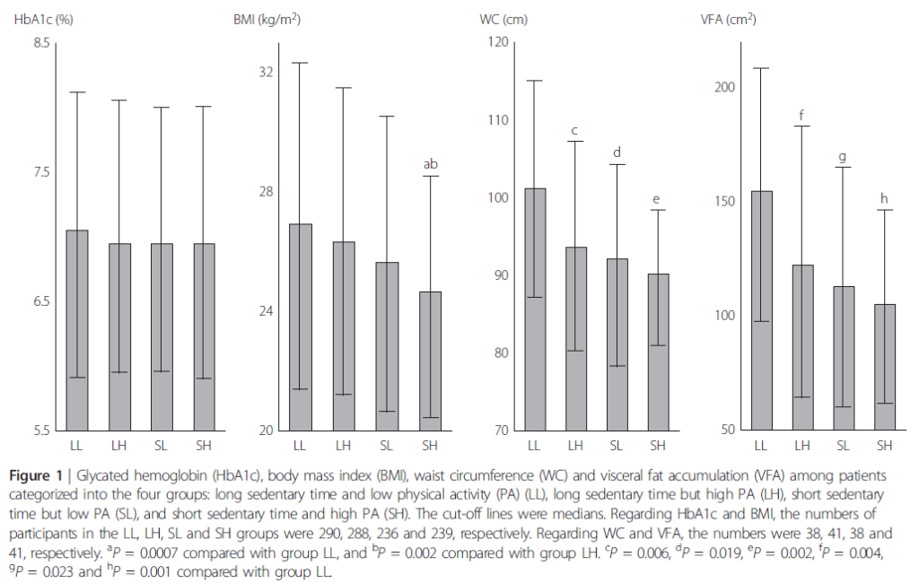 次に、「ST(座位時間)」を「長い(L)、短い(S)」、「PA(身体活動性)」を「高い(H)、低い(L)」に分類して、[LL:座位時間(長)&身体活動性(低)、LH:座位時間(長)&身体活動性(高)、SL:座位時間(短)&身体活動性(低)、SH:座位時間(短)&身体活動性(高)]の4つのグループに分類し、「HbA1c、BMI、WC(ウエスト周囲)、VFA(内臓脂肪)」の影響を検討した。