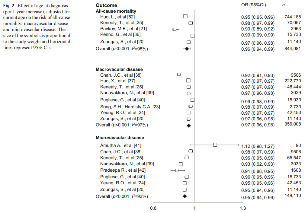 1,325,493例を含む5件の研究データにおいて、2型糖尿病診断時の年齢が1年増加するごとに「全死亡リスク」は4%減少することが示された[OR 0.96(95%CI 0.94-0.99)、p<0.001]。