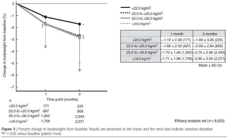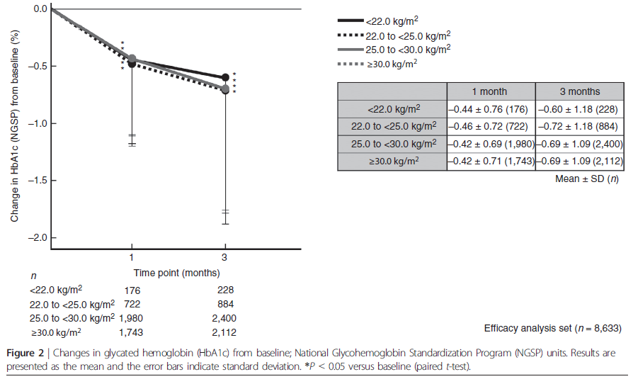 となり、有意な血糖コントロールの改善が認められた(全てのp<0.05)が、ベースラインから3ヶ月の体重変化は、上位3つのBMIサブグループ間で類似していたが、下位のBMI<22.0の減少は小さかった。