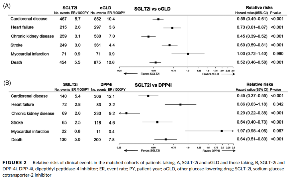 実臨床において、CVRD(心血管腎疾患)の既往がない日本人2型糖尿病患者は、他の糖尿病治療薬(メトホルミン、DPP-4阻害薬、SU薬、チアゾリジン薬、グリニド薬、α-グルコシダーゼ阻害薬、GLP-1受容体作動薬、インスリン)と比較して、SGLT2阻害薬で治療を開始する方が、「心腎疾患、脳卒中、全死亡」のリスクが低いことが示された。
