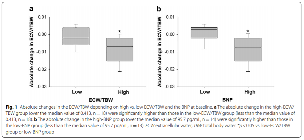 ベースラインと比較した「体重、BMI、BNP(脳性B型ナトリウム利尿ペプチド)、体液パラメーター(ICW、ECW、TBW、ECW/TBW)」は、SGLT2阻害薬の投与1週間で有意に減少した。