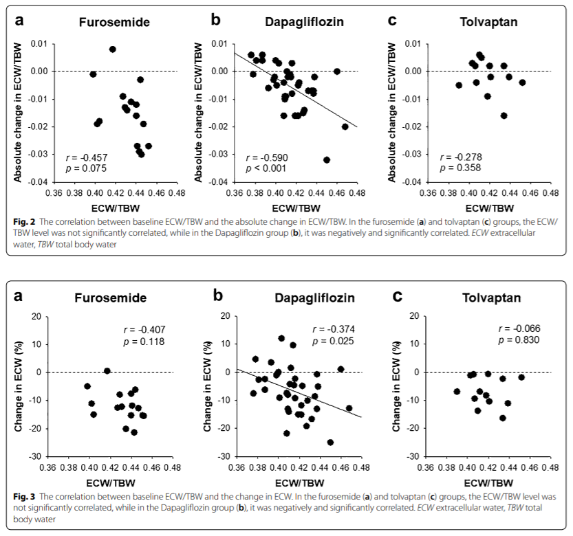 また、ベースラインから7日間の「ECW/TBWとECWの絶対変化量」における相関係数は、それぞれ、(r=-0.590、p <0.001)と(r=-0.374、p=0.025)となり、SGLT2阻害薬のみで有意な負の相関(浮腫比が高いほど細胞外液量が減少)が示された。