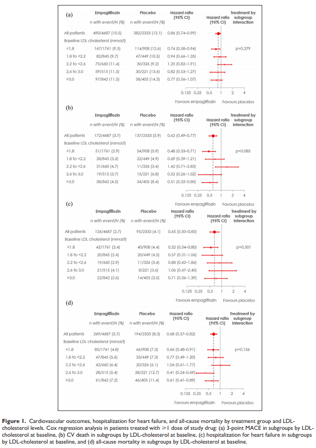 SGLT2阻害薬(エンパグリフロジン)の有益な心血管保護効果は、ベースラインのLDLコレステロールレベルに関わらず一貫していた。